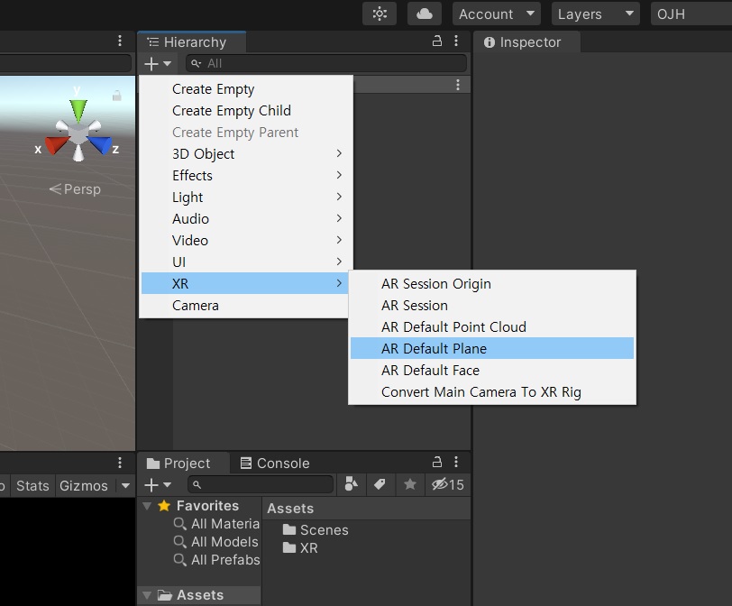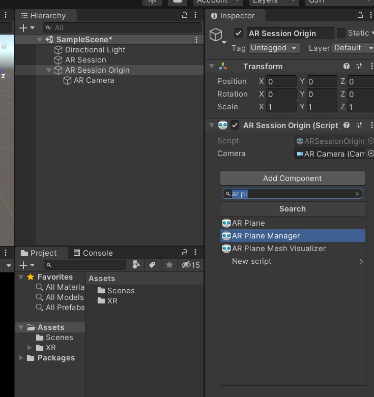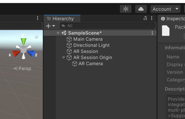 하이어라키 창에 AR Session과 AR Session Origin을 추가한다.