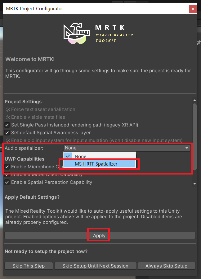 Audio spatializer를 MS HRTF Spatializer로 선택해주고 Apply를 눌러준다.