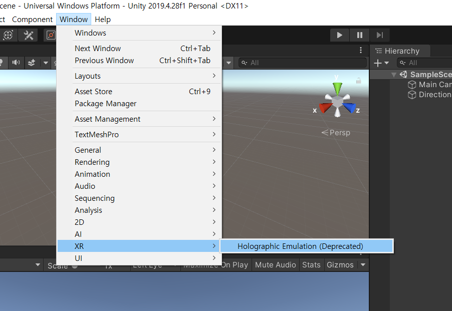 Window - XR 탭에 있는 홀로그래픽 애뮬레이션 클릭하면