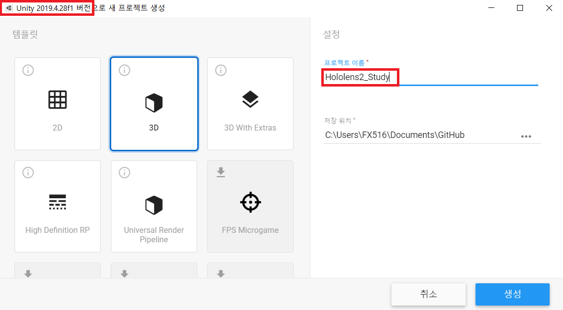 1. 2019.4.28 버전으로 유니티프로젝트를 생성