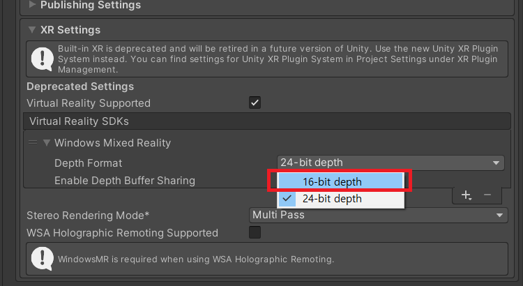 Virtual Reality Supported를 체크하면 다음과 같은 탭이 등장한다.