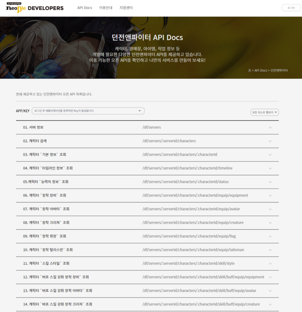 위의 사이트는 네오플에서 운영하는 사이트인데 회원가입을 하고 KEY를 받아서 실습을 진행할 수 있다.