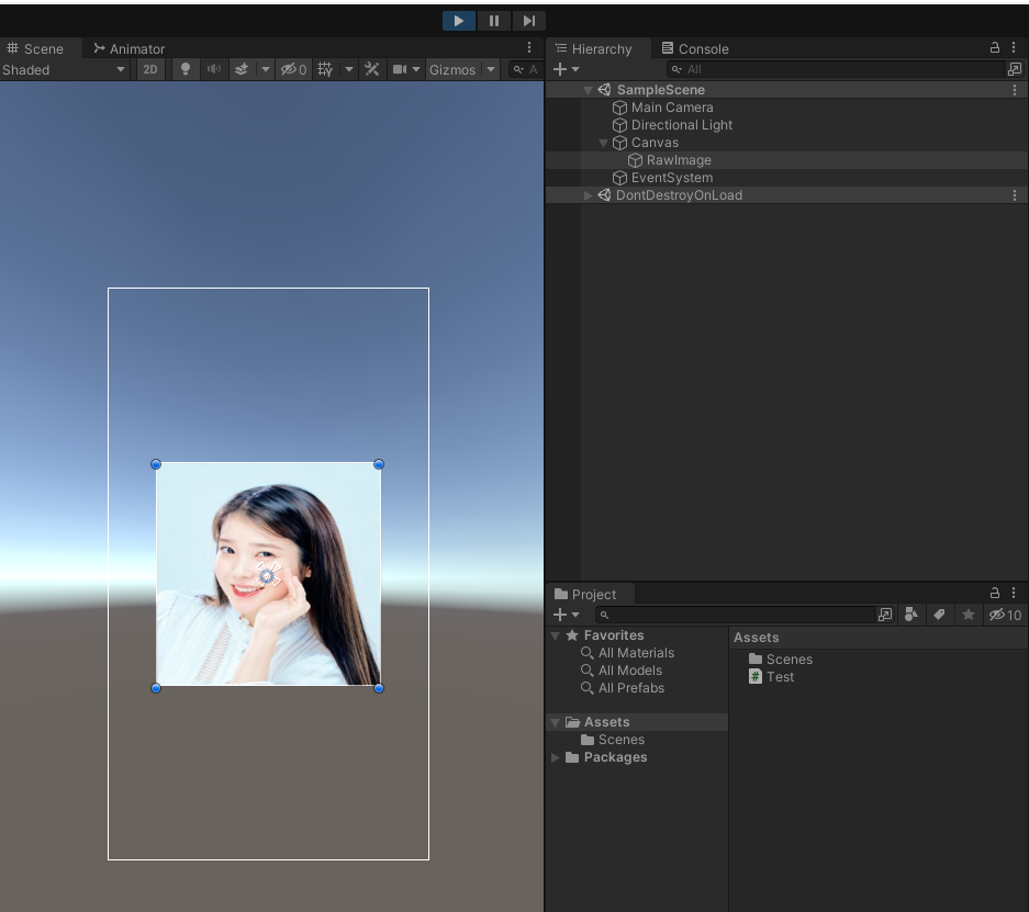플레이를 누르면 rawimage에 아이유 이미지가 들어간 것을 확인할 수 있다.