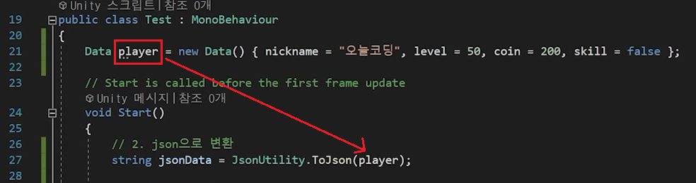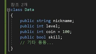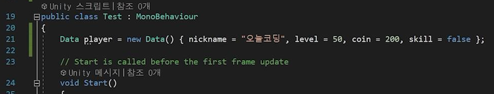위에처럼 하지 않고, player.nickname = "오늘코딩"; 이런식으로 Start 쪽에서 정보를 넣어줘도 되고,