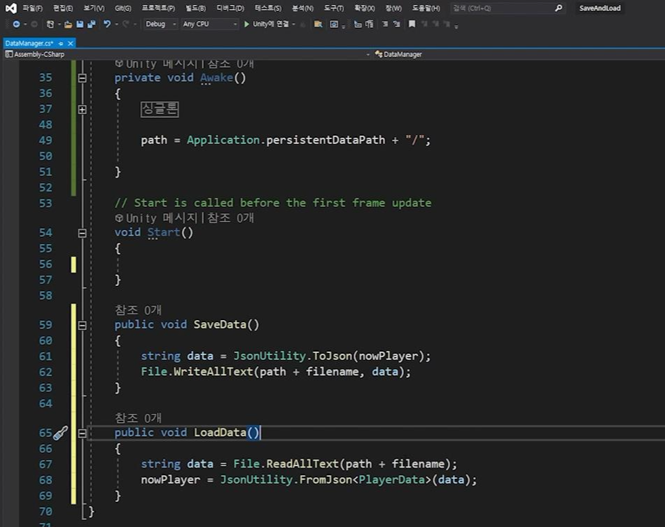 고로, 아까전에 start부분에서 작성했던 저장 코드는 SaveData라는 함수를 만들어서 그곳으로 옮기고