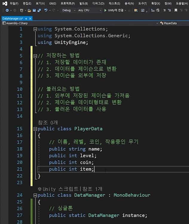 다시 DataManager 스크립트로 돌아와서 위에서 PlayerData라는 클래스를 생성했기 때문에