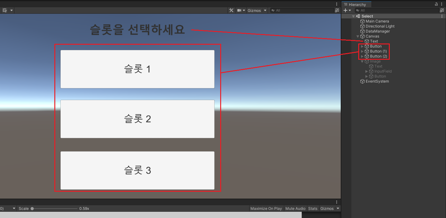 여기서 저장된 데이터가 있는 슬롯을 클릭하면 곧장 로드를 한다음에 게임씬으로 넘어가면 되지만,