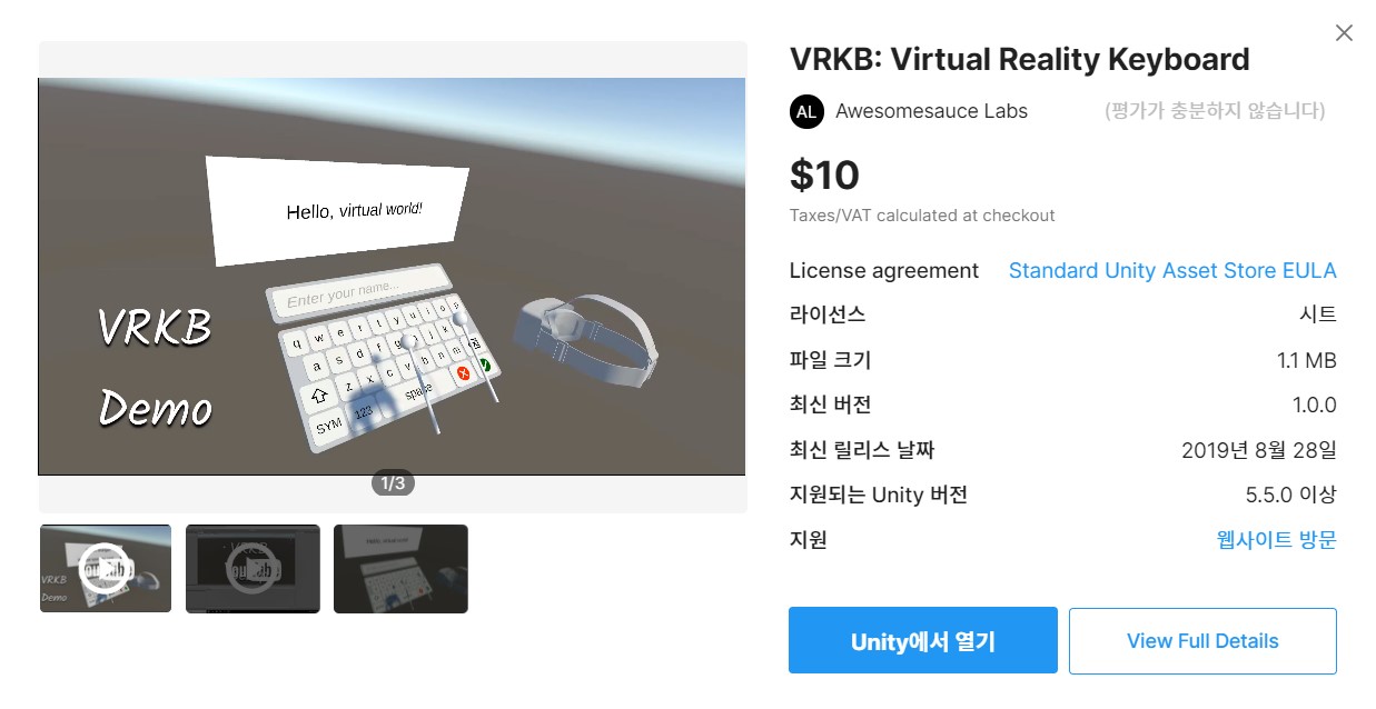 VRKB:Virtual Reality Keyboard 라는 이름의 에셋으로